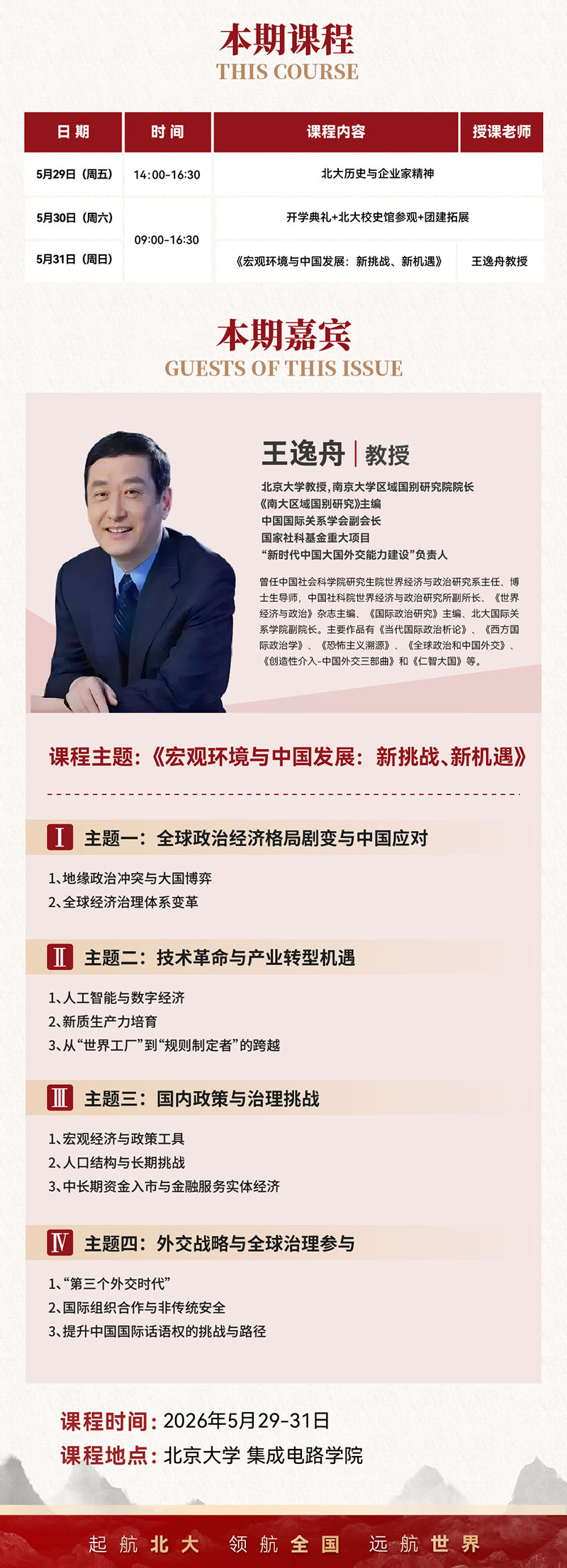 | 5月31日(周日) | 09:00-16:30 | 《宏观环境与中国发展:新挑战、新机遇》 | 王逸舟教授 |