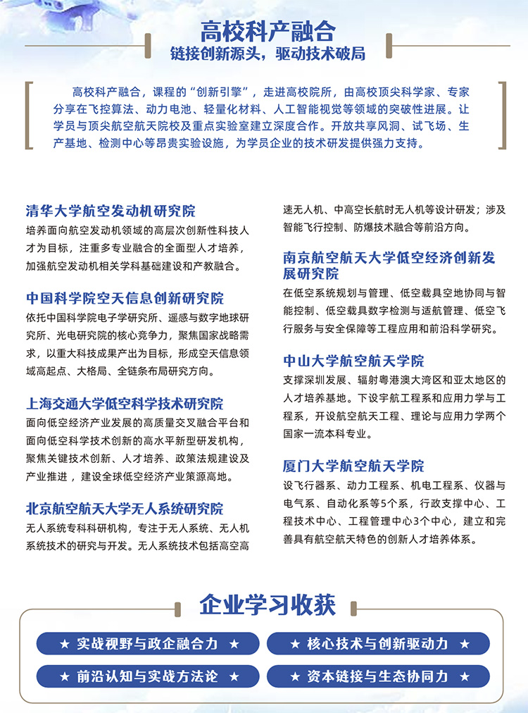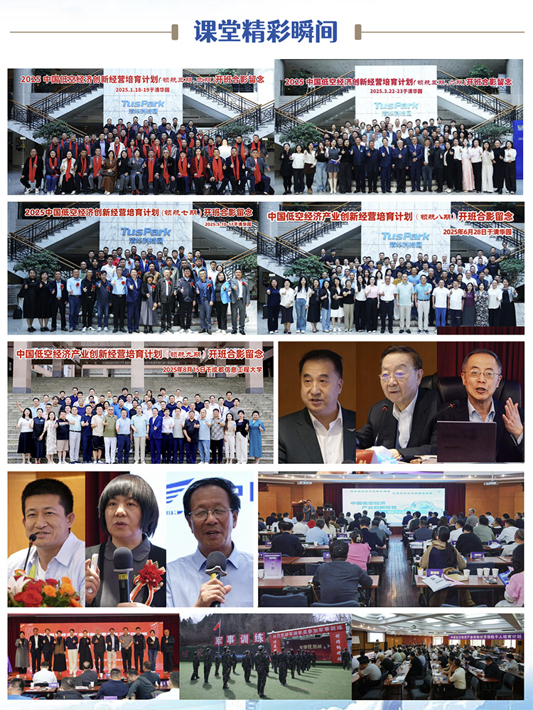 “中国低空经济产业创新经营领航千人培育计划”汇聚了100+民航、工信、科技部政策专家,低空通 航领域院士、科学家及全球领军企业组成的导师矩阵,整合政府、高校、科研机构、行业标杆、同学企业 资源,帮助低空经济产业链上下游企业家及投资人挖掘产业价值链上下游的潜在机会,推动低空经济成为 传统产业的转型升级工具,为企业在多领域开展 “低空经济+”的业态融合做创新破局。