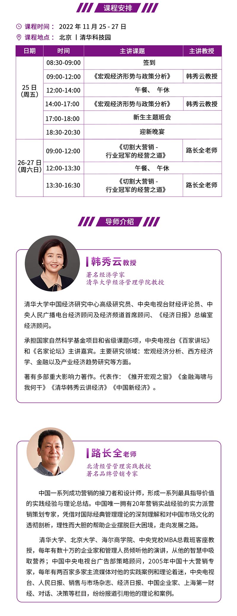 清华韩秀云教授、路长全教授重磅联袂!11月25-27日等你来!2022第️️期工商管理EMBA卓越总裁班招生进行中……
