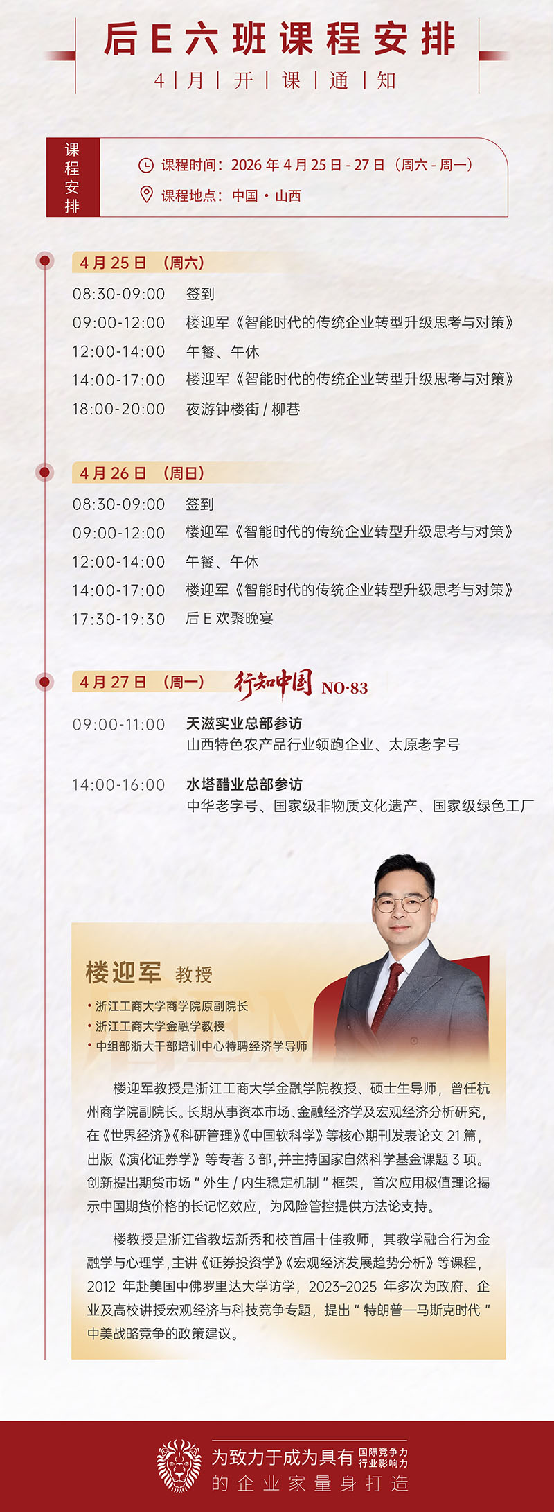 我们深信在后E的学习将是您人生中最值得回忆的美好时光之一!非常期待与最优秀的中国企业家共同开启这一段有高度、有深度、有温度的学习之旅。现将4月课程安排通知如下,请认真阅读。