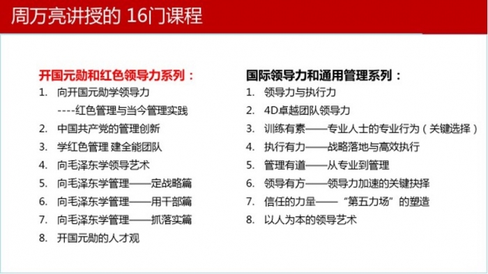 周老师既研究党史党建、又研究领导力;既研究东、西方管理,又有北大教学经验和管理实践经验。培训中理论联系实际,并将领导力国际理念、红色管理经典、中国传统文化、优秀管理实践融会贯通,有系统,听着不乱;重体验,听着不闷;可应用,听着不空,因风格独特并贴近实践而赢得普遍赞誉。