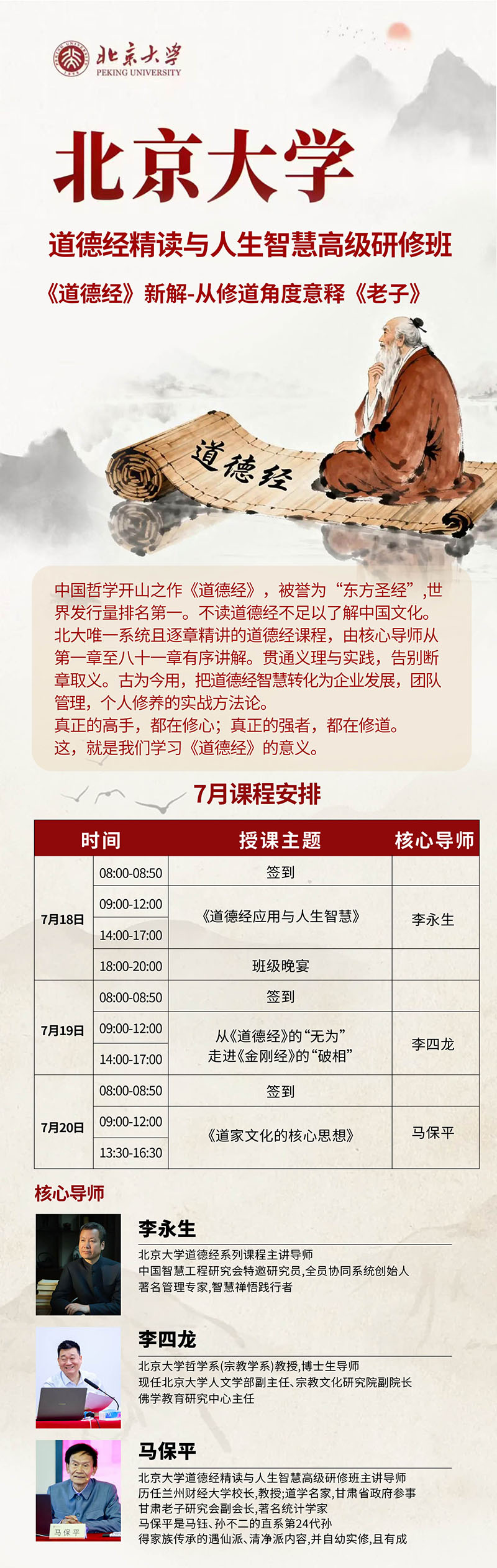北京大学道德经精读与人生智慧班7月18-20日课程安排