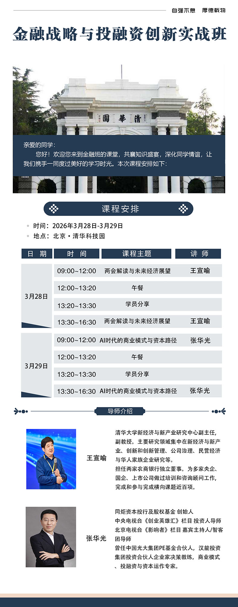 A1: 课程设计具有极强的递进逻辑。第一天王宣喻老师的《两会解读与未来经济展望》为您奠定宏观政策与产业趋势的认知基础,明确“往哪个方向走”;第二天张华光老师的《AI时代的商业模式与资本路径》则聚焦微观层面的企业实操,解决“具体怎么干”。两天课程形成“宏观+微观”、“政策+资本”的完整闭环,建议全程参与以获得系统性收获。
