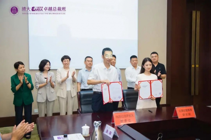 张店经济开发区工委会副书记周志军代表张店经济开发区管委会与北清经管高等研究院EMBA项目班主任王弘宇老师进行了项目合作意向书签约。