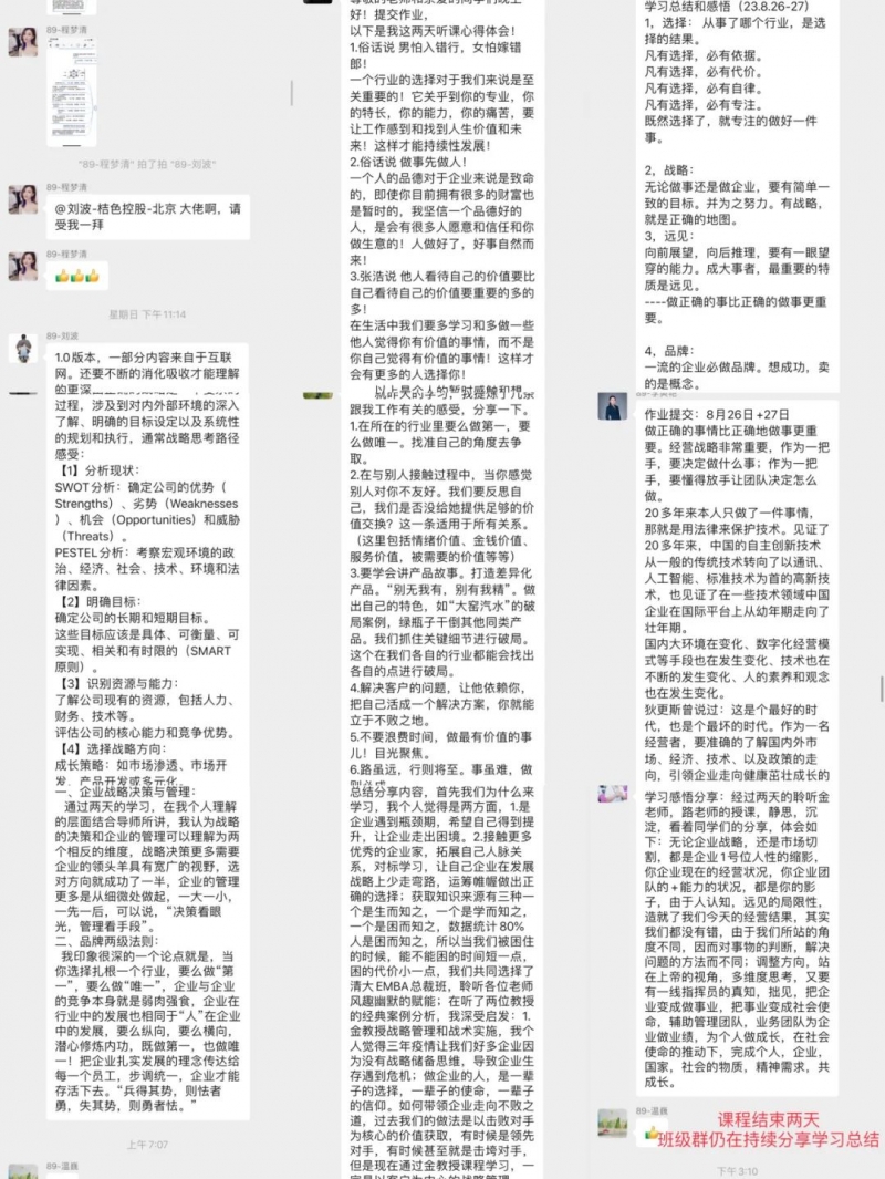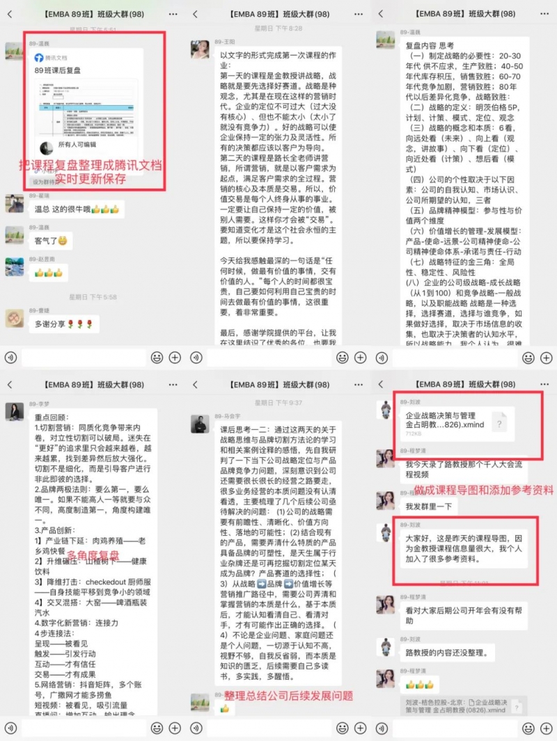 在进行了金占明教授《企业战略决策与管理》和路长全教授《品牌两极法则》两日课程的学习之后,刚刚迎来开学典礼的89班同学进行了他们第一次的课后复盘。同学们从战略、品牌、创新多个维度;用思维导图、腾讯文档、文案大纲等各种形式;从互联网创业家到00后新生代,同学们的分享自发的持续了整整三天,截止到现在,仍然在不断更新着…这是班主任愿意看到的学习成果,也是学院深刻打磨研发师资的动力、更是企业家不断学习的初心。愿以终身教育陪伴行业领导者共同学习成长!