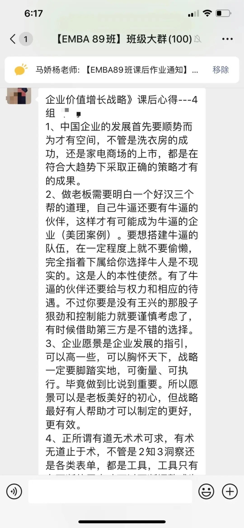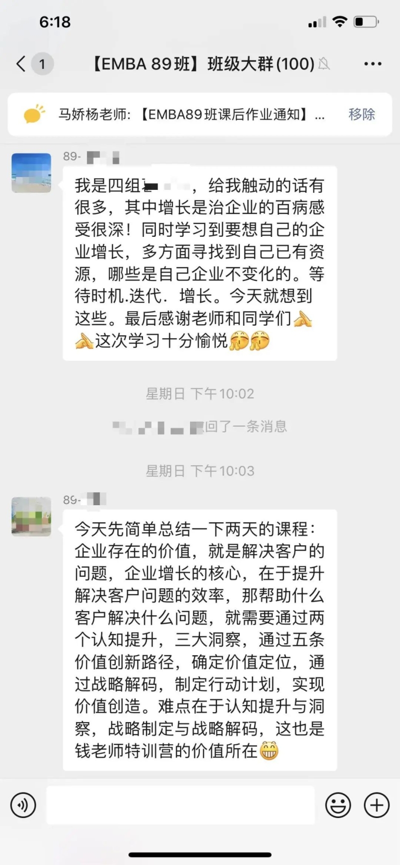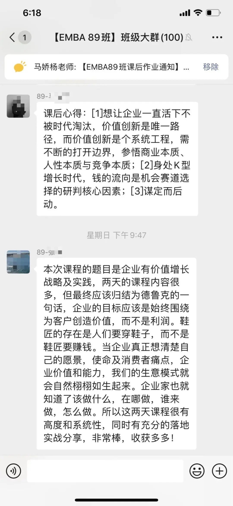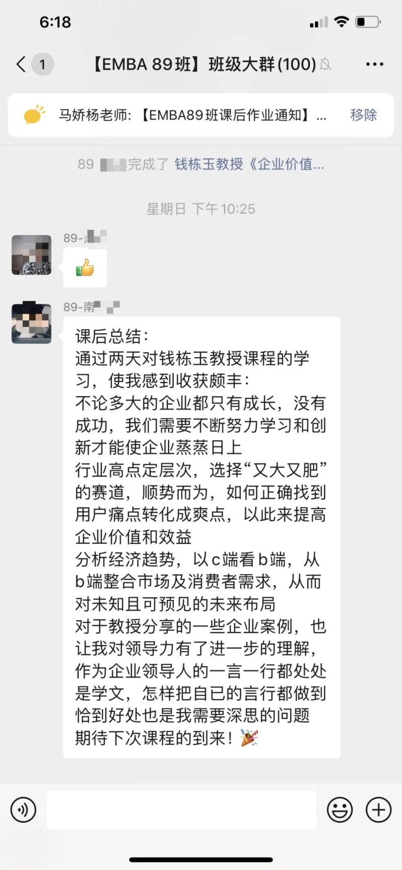 课后感悟:在新的大环境,迎接新的增长时代。不能按照过往的经验做判断,要应用科学的手段和详细的数据。行业高点等层次,企业要选择“又大又肥”的行业作为前进的方向。现有的经营项目要打开边界,按照2X2的矩阵规则,寻找新的增长点。提升自身的认知,每完成一个目标,就要重新设定新的企业愿景。通过愿景不断制定企业经营新的战略和战术,达到新的增长曲线。透过现象看本质,看透人性是非常重要的手段。最重要的一点就是企业要不断体现为客户创造价值。需要常常复习三大洞察,五大路径,做到成为解决企业增长问题的第一反应。感谢钱教授的丰富课程,感谢马老师的辛苦付出,感谢同学们营造的浓厚学习氛围。大家共同努力,实现不断增长,永远在进步。