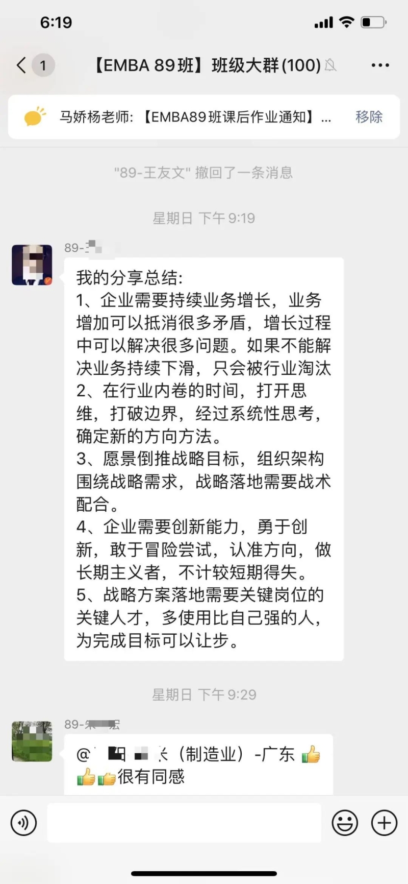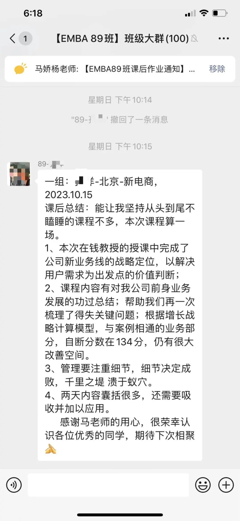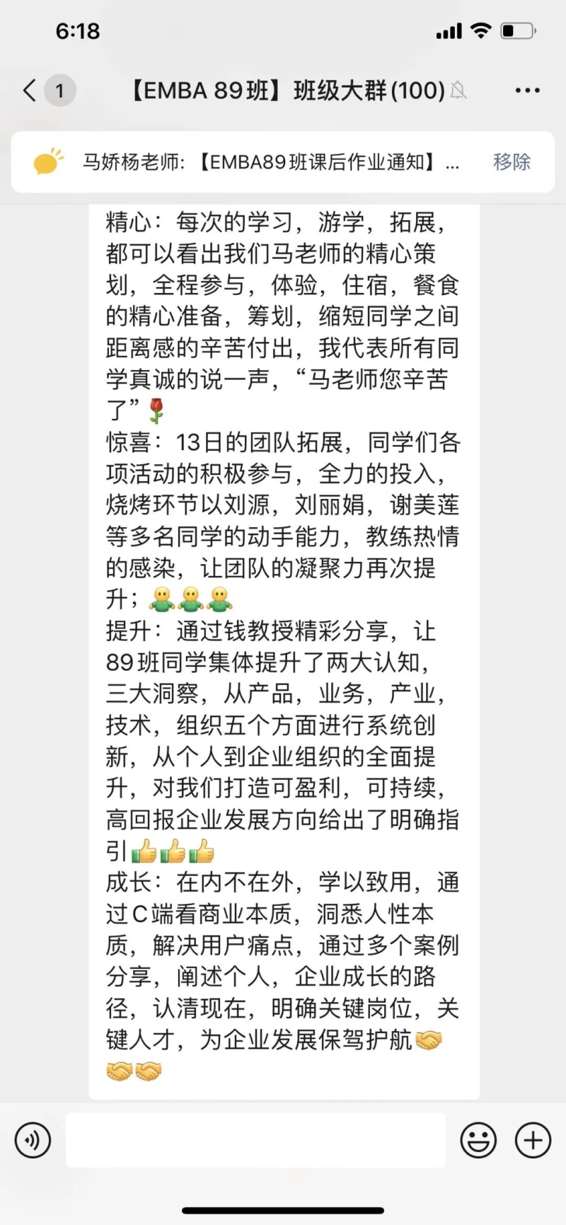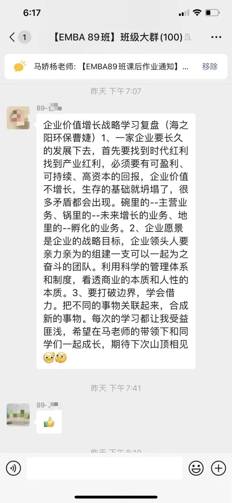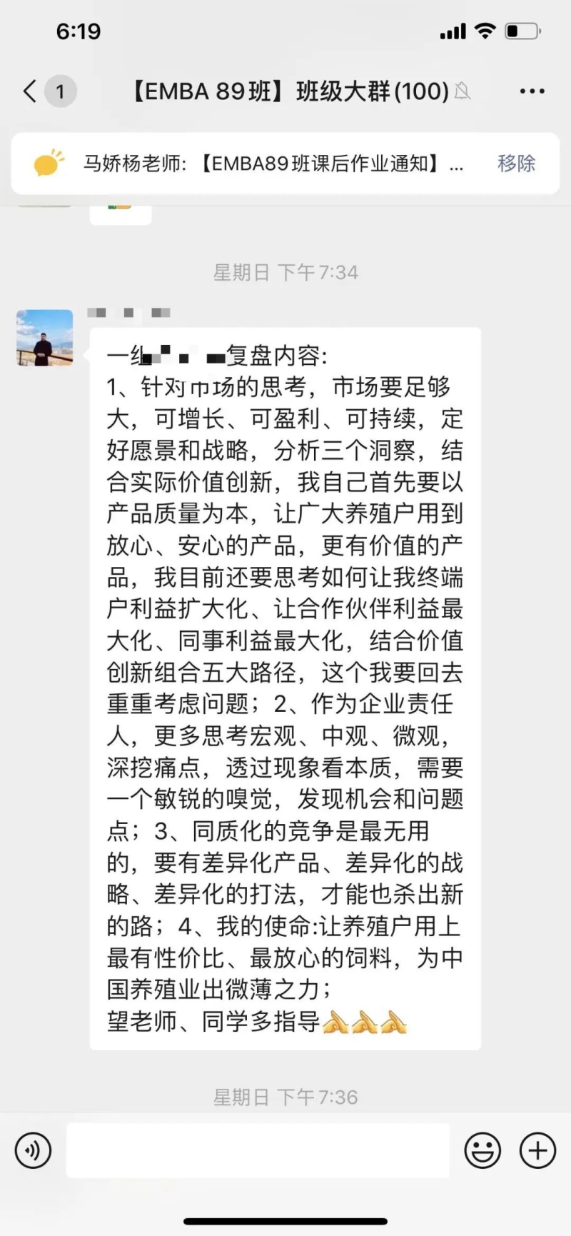 课后感悟:在新的大环境,迎接新的增长时代。不能按照过往的经验做判断,要应用科学的手段和详细的数据。行业高点等层次,企业要选择“又大又肥”的行业作为前进的方向。现有的经营项目要打开边界,按照2X2的矩阵规则,寻找新的增长点。提升自身的认知,每完成一个目标,就要重新设定新的企业愿景。通过愿景不断制定企业经营新的战略和战术,达到新的增长曲线。透过现象看本质,看透人性是非常重要的手段。最重要的一点就是企业要不断体现为客户创造价值。需要常常复习三大洞察,五大路径,做到成为解决企业增长问题的第一反应。感谢钱教授的丰富课程,感谢马老师的辛苦付出,感谢同学们营造的浓厚学习氛围。大家共同努力,实现不断增长,永远在进步。