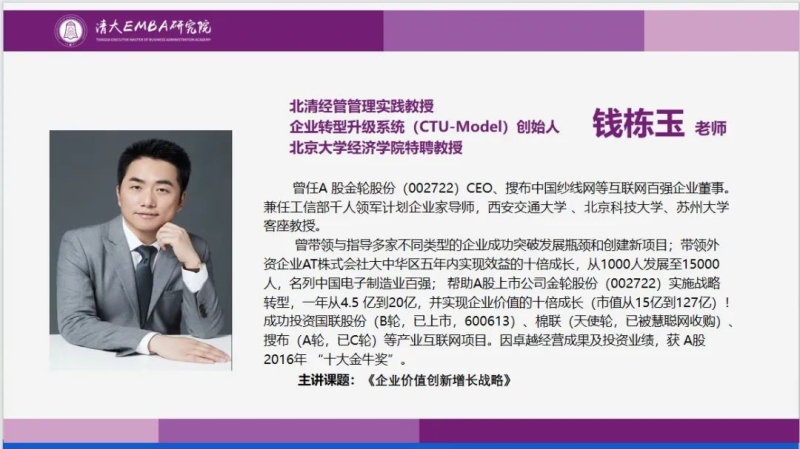 清大EMBA89班在周末两日,迎来钱栋玉教授《企业价值价增长战略》增长大课,钱教授被同学们亲切的誉为“离增长最近的老师”。