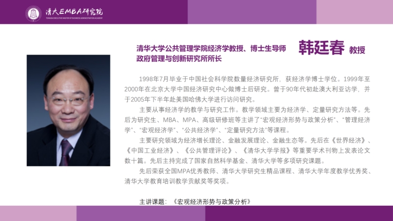 开学第二模块内容,则是由清华大学公共管理学院经济学教授、博士生导师,政府管理与创新研究所所长,韩廷春教授,带来的《宏观经济形势与政策分析》的精彩授课。