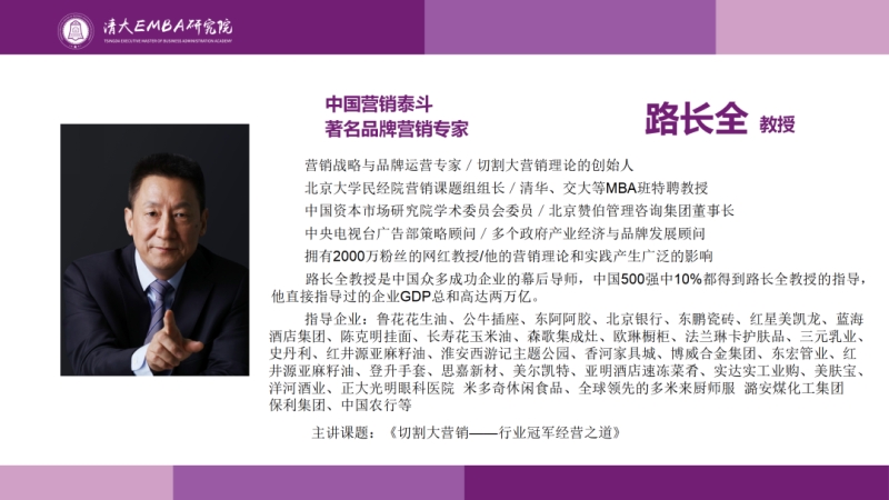路长全教授作为营销战略与品牌运营专家,切割大营销理论的创始人,中国一系列成功营销的操刀者和设计师,有着一系列最具指导价值的实践经验与理论总结。