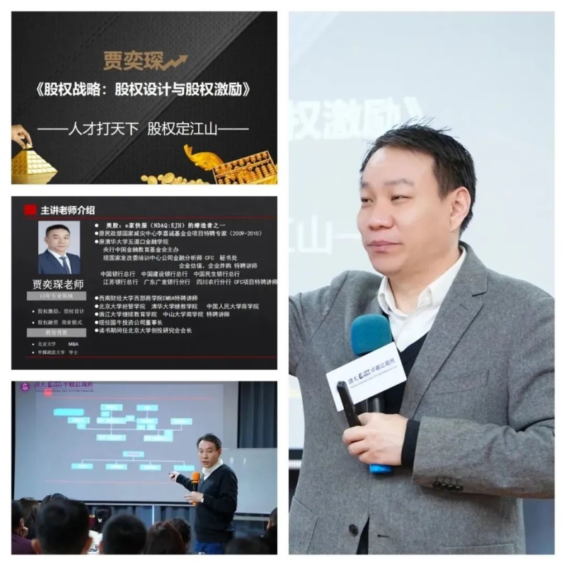 本次课程的主题是《股权设计与股权激励》,由北清经管管理实践教授、著名股权设计实战专家贾奕琛教授为大家带来这门精彩课程。贾老师是清华大学五道口金融学院特聘教授,民政部李嘉诚基金会项目特聘专家,国家发改委培训中心企业值估、企业并购课程特聘讲师。美股e家快服(NDAQ:EJH)的缔造者之一,三五互联(300051)股权激励顾问、吉林省省投集团股权投融资规划战略顾问、浙报集团(600633)并购重组股权治理顾问。专注商业股权领域15年,通过“股权激励、股权治理、股权融资”股权战略设计三步曲辅导多家企业完成股权顶层设计、成功融资、留住核心人才、实现业务增长。所授课程以“系统、实战、落地”深受EMBA学员喜爱。
