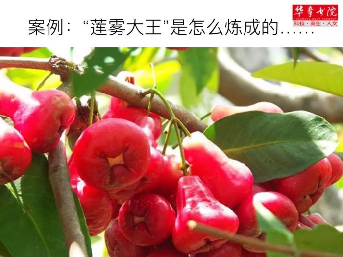 有一位屏东的果农就想,我为什么不能采取一种全新的营销模式?我可以“直供超市”,把我的莲雾早上三、四点钟采摘下来,趁着特别新鲜的时候,送到便利店的各个寄售点。当消费者在六、七点钟买早餐的时候,就能够买到最新鲜的盒装莲雾。他们吃到莲雾之后,发现果真跟自己从传统渠道买的莲雾不一样。所以,他们就开始买给自己的朋友,推荐自己的朋友、亲人、同事去买,这样就引发了营销上的所讲的“口碑效应”。