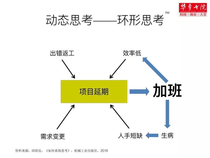 但是,我们要想学会系统思考,必须要实现思考的升维,也就是要增加一个思考的维度:不要仅仅停留在单一的从原因到结果的这样一个维度。我们要思考因果的动态性,也就是:项目延期会带来什么样的后果,或者产生什么样的影响?