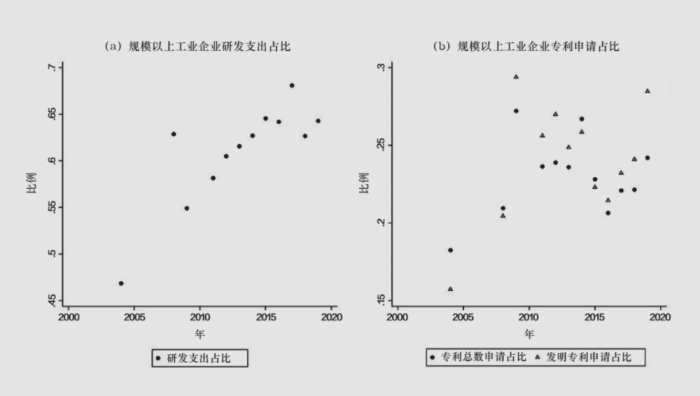 图3 中国规模以上工业企业研发支出、专利申请在全国经济创新活动中的占比