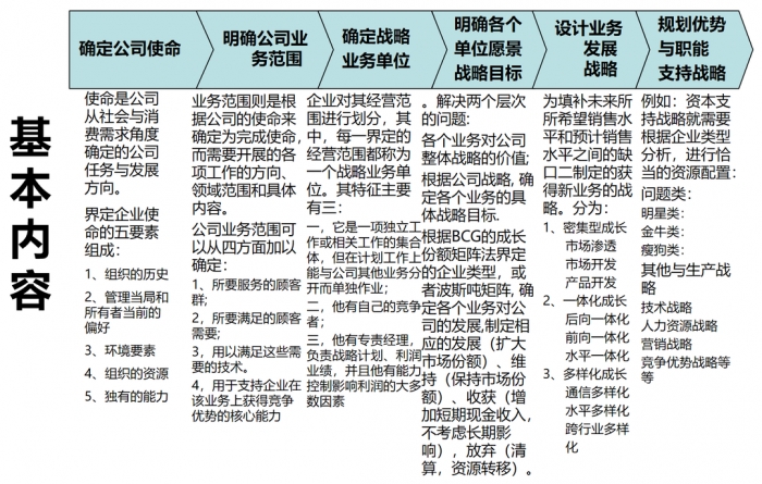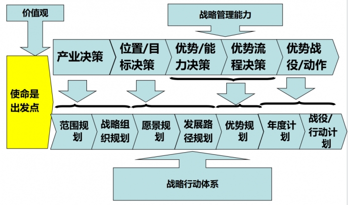 公司战略管规划程体系:从公司发展使命到业务范围、以业务为单位的经营目标和策略的决策。
