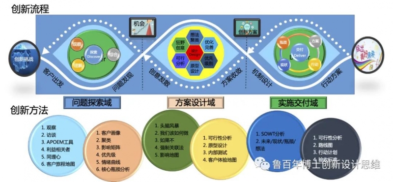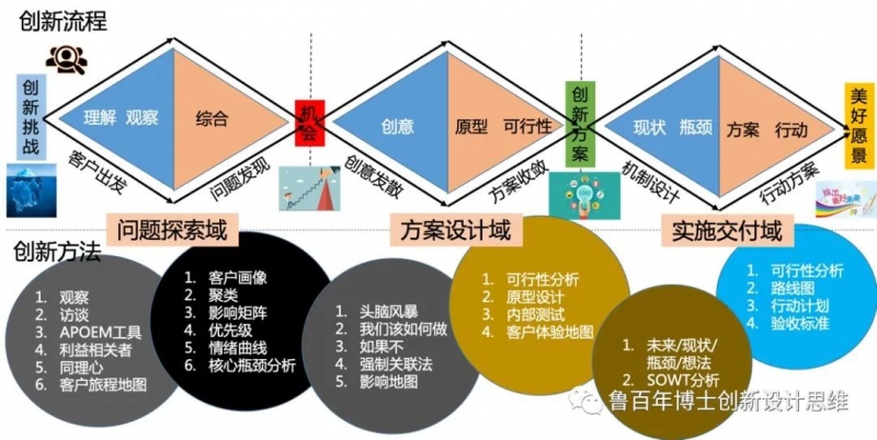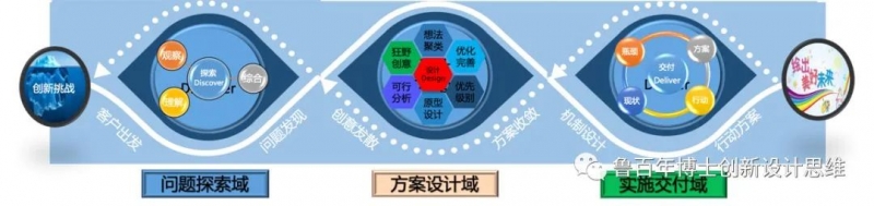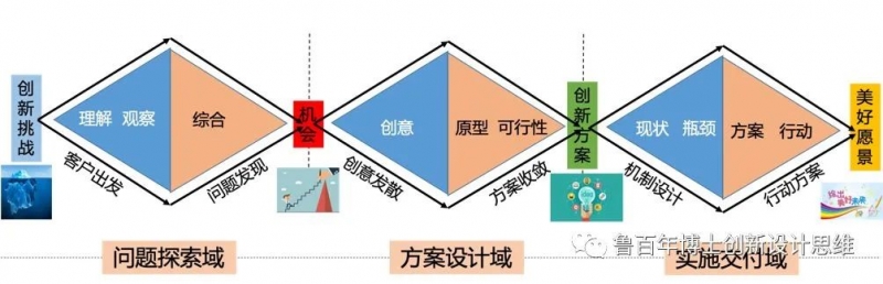 方案设计域的目的是探索创新挑战或者机遇的创新方案,从组织为解决用户的痛点出发进行发散,从各个不同的角度寻求创新的让用户满意的解决方案。然后对创新的创意进行聚焦,通过原型设计和可行性分析,获得创新的解决方案。
