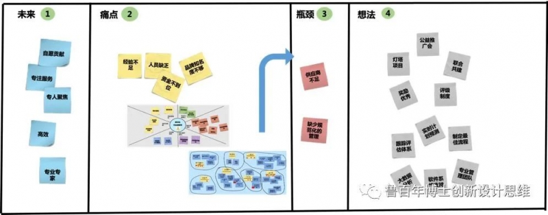 对于获得的创新创意,一般是通过工作坊的模式实现的,由参与的各个利益相关者和设计人员一起,充分提出大胆狂野的想法,一般分为罗列想法,将想法聚类,再完善优化想法,最后对想法进行优先级投票,这样进行发散-收敛。