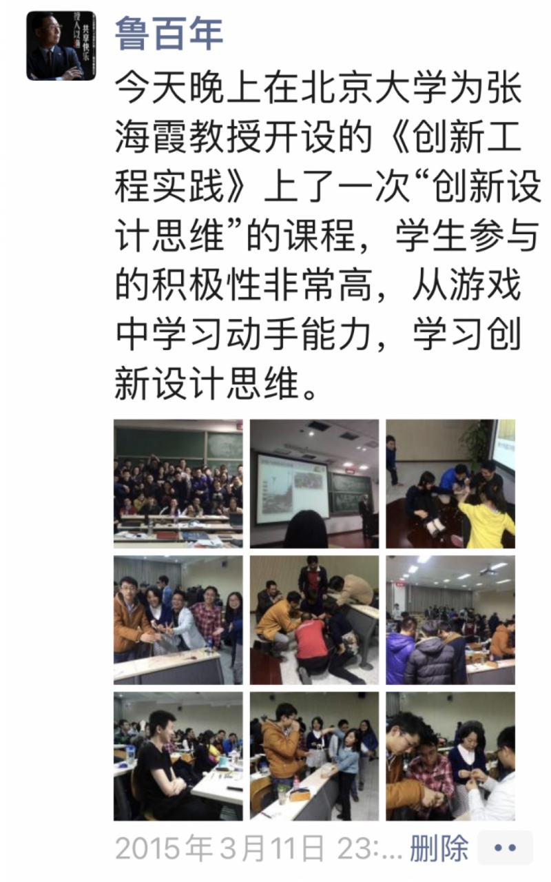 鲁老师用流程化的形式“搬运”了d.School的授课方式:没有桌子、没有凳子,没有照本宣科的老师、没有昏昏欲睡的同学——只有一起做游戏的创新团队。课程只做四件事:玩游戏、进行头脑风暴、用乐高橡皮泥做原型、演小品讲故事。这或许也是鲁老师的课程备受学生喜爱的主要原因:同学们从不觉得自己在上课,而是在玩耍。