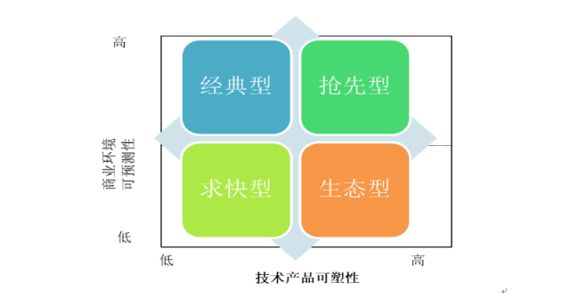 (4)生态型战略:或平台型战略,即面临潜力巨大且有机会重新定义行业标准的新兴市场,但商业环境不确定或投资风险极大,类似于中国目前风起云涌的智慧城市建设市场,国家发改委、住建部迄今也没有出台相应的行业标准,地方城市政府争相建设、自主定义、自立标准。在这种情形下,企业可以搭建一个公共平台,建立产业生态圈,协调引导生态圈企业的技术产品开发。