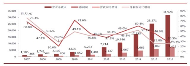 从成立之初公司就一直保持高速增长趋势,2007 年至今,公司营收从11.9 亿增长至319 亿,10年复合增长44.2%,增长26.8 倍,净利润从3.65亿增长至74.2 亿,10年复合增长39.7%,净利增长20.3 倍。