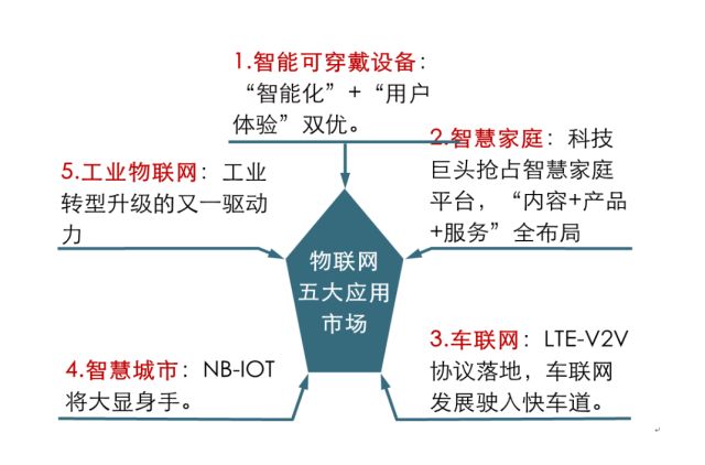 我们看这个产业链,它非常庞大。业界普遍认为2018年是物联网元年,从智能冰箱食材自动采购、机场海康威视的无人值机安检、语音智能电视等技术的逐渐落地,智能时代正在来临。我将物联网应用市场分为五类,前期我们做了一些这方面的研究,每一个市场都将出现巨大的颠覆性改变,与我们生活的方方面面息息相关。