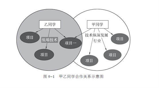 从图9-1 中,我们可以看到:甲和乙共同组建公司,是一种合作行为。双方除了少许资金投入外,各自都投入了营销资源和技术研发资源。这体现了公司的人合性。而在不同的商业模式下,这些资源的价值完全不同。乙的思路是趁着应用性技术可以相对简单地获取项目,快速把公司的业务做大。所以,无论是什么行业的项目,拿一单,是一单。而且,在这种发展思路下,他的营销资源可以得到最大限度的利用,他对公司的驾驭力也是强的。