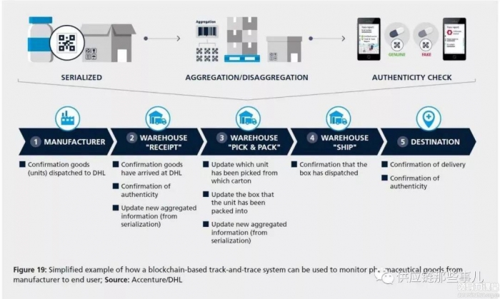 在这方面,DHL 和埃森哲使用区块链成功地实现了基于序列化的全程药品追踪系统。药品序列码是每个单独包装的唯一身份,记载了有关来源、批号和失效日期等关键信息,任一包装在几乎任何时刻都被记录并跟踪到其地理位置。DHL 和埃森哲的项目有效地展示了区块链应用的可行性。项目目标是证明药品来自合法的制造商,而不是假冒的,并在从原产地到消费者的过程中得到了正确的处置。