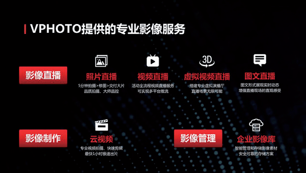 VPHOTO提供的服务简单来说可以分成三个部分:一是影像直播,二是影像制作,三是影像管理。