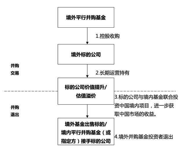 跨境平行并购基金的境外基金部分的核心盈利模式,与传统的国际并购基金类似,可以通过目标企业股权的流动性溢价获利(IPO、战略性出售),也可以通过管理提升目标企业价值,并且在与境内基金联动投资境内项目,进一步获得中国市场的收益。而在境外基金出售标的公司股权时,境内基金(或其指定方)具有优先收购权。