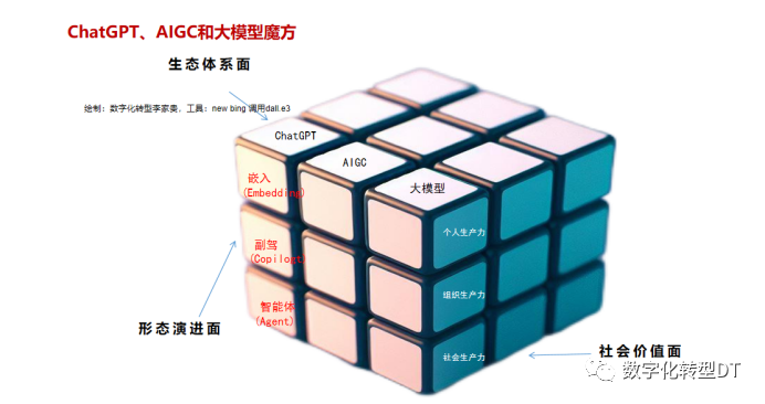本原创文章为2023年国庆超6小时爆肝创作,力图深入浅出,融合作者入坑10个月的认知,从三阶原创魔方的三个面来展开,层层阐述。魔方第一个面是从产品生态的三个断面,ChatGPT、AIGC和大模型;第二个面是产品形态的三个演进,Embedding(知识嵌入)、Copilot(通用软件形态)和Agent(高级阶段)。本文会附送大量不需要氪金的免费攻略,各位可以直接免费收藏取用。
