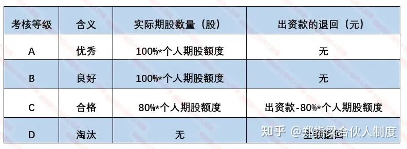 同时公司规定合伙人年度考核等级在D级的,本年度的期股额度取消。