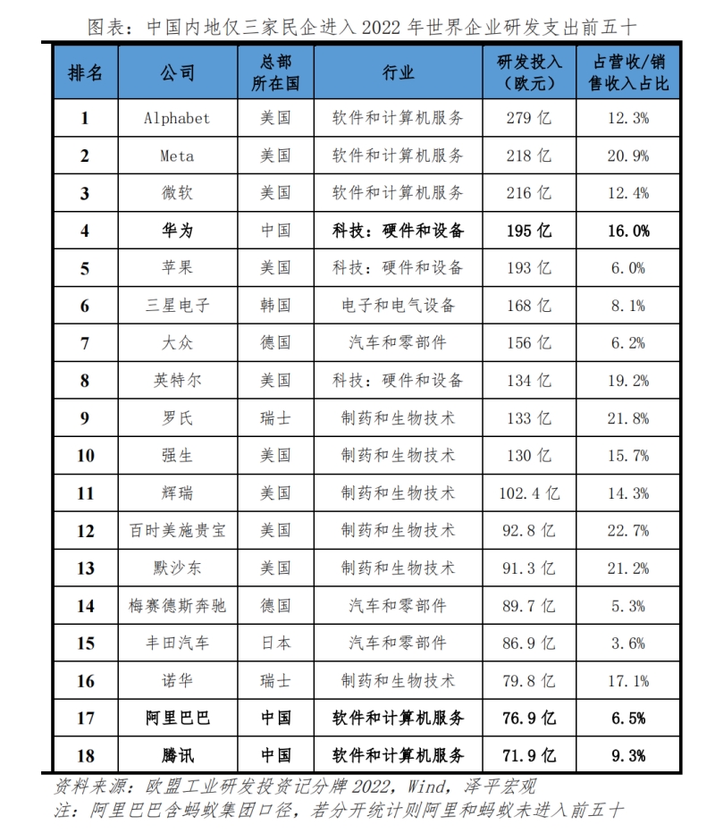 三是在基础研发和领头企业投入层面,同发达国家依旧存在差距。我国基础研发占比较低,企业参与基础研发占比进步空间巨大。由于基础研究短期投入产出不成正比,企业更加倾向把研发费用投入应用研究,以便产生直接的应用成果。虽然近几年更多的民营科技企业意识到“核心技术买不来”和基础研究的重要性,但整体看包括民营和国有企业在内,我国企业参与基础研发的水平仅为7%,较主要发达国家均高于20%的水平差距依旧较大;
