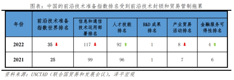 四是外部环境不确定性大,美国等发达国家对我国的出口管制和技术封锁形成阻力。自特朗普政府后,出口管制和技术封锁成为美国扼制中国的主要武器。例如美国对中国半导体芯片企业先后实施多轮制裁,对成品芯片出口、晶圆厂代工生产和产能的扩充进行限制,封锁核心技术和先进工艺对中的转移。目前我国在光刻机、芯片、操作系统、手机射频器件、激光雷达、核心工业软件、核心算法等关键技术被“卡脖子”,短期内一定程度阻碍了尖端研发创新的速度。前沿技术准备指数衡量了各国使用、采用和适应前沿尖端技术的水平,中国该指数排名从2021年的第25位下降至2022年的35位。信息通信技术运用、贸易活动的排名的下降成为拖累,与研发投入费用的提升和排名第一的研发成果数量不相匹配。