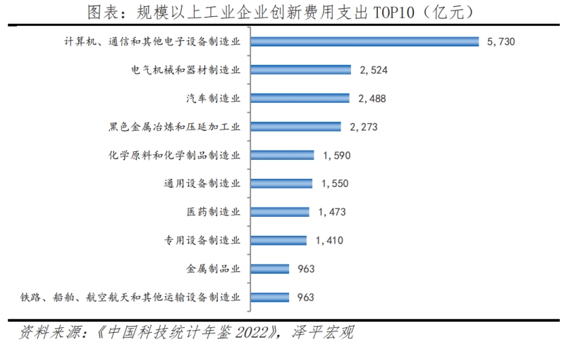 创新领域上聚焦高端制造业,制造业创新投入占比高达96%。2021年规模以上工业企业的创新费用总计为28789.5亿元,其中制造业占比达95.6%。分行业来看,发展计算机、通信和其他电子设备制造业顺应了5G、人工智能、数据中心等新基建的大势,创新投入高达5730亿元,远超位于第二三四排位的电气机械和器材制造业(2524亿元)、汽车制造业(2488亿元)、黑色金融冶炼和压延加工业(2273亿元)。