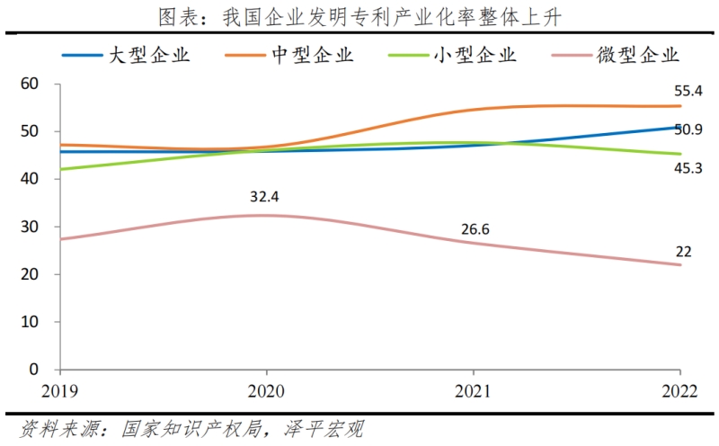 我国企业发明专利呈现产业化趋势,专利支撑实体经济能力不断提升。专利产业化的过程是将专利投放到市场并转化为商业价值,是企业竞争的重要手段。根据《2022年中国专利调查报告》,我国发明专利产业化率从2018年32.3%稳步提高至2022年36.7%,反映出我国发明专利支撑实体经济能力稳步提升。2022年不同规模企业的发明专利产业化率从高到低依次为:中型企业(55.4%)> 大型企业(50.9%)> 小型企业(45.3%)> 微型企业(22%)。