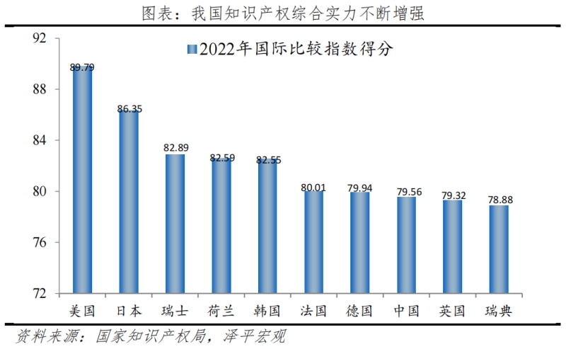 中国进入创新性国家行列,知识产权综合实力不断增强,中国PCT专利申请量位居世界第一。知识产权对国家科技进步、企业经营安全有着重要的推动作用。根据《2022年中国知识产权发展状况评价报告》,2022年我国知识产权国际比较指数得分79.56,较上年增长0.67,排名世界第八。各分项指数(发展环境、产出能力、市场价值)排名均跻身世界前十,表明我国知识产权综合竞争力稳步提升。发明专利根据《中国科技统计年鉴2022》,中国申请人提交的PCT国际专利申请量于2019年赶超美国并连续三年位居世界第一。2001-2021年,中国PCT专利申请量的年化增速达20%,远超韩国(12%)、日本(7%)、美国(2%)。