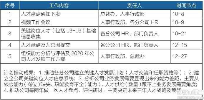 表1、表2是我操盘过的两家企业的人才盘点计划框架。其中,A公司的计划框架相对简单,主要以推动人才发展计划、分析组织能力长短板,进而推动未来公司的人才战略为主。B公司主要定位在人才继任者计划上,侧重于找到各层级对应的继任人员,建立起一整套人才继任系统。由于两者的动机不同,所以在操作角度就会产生细微的差异。