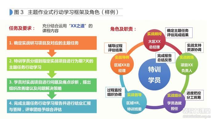第一种形式是基于问题解决的行动学习,我将其称作“主题作业”,通过背景导入、主题研讨、现场实践、专题汇报等形式完成,主要表现为“理论学习+实践作业”的形式。需要注意形式、专业、时间、效果四个问题。