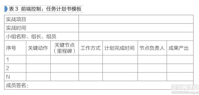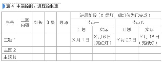 表3是一个逻辑清晰的任务计划书,里面包含5个基本要素:项目、时间、人员、节点、承诺。在启动主题作业时,每个小组都要通过对主题任务的理解来填写这份表单,使主题任务分解到各个节点,并且签名承诺。该任务计划书也会变成主题任务执行过程中学员、管理方协同工作的节点判断。