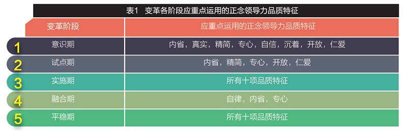表1归纳了组织变革各阶段及各阶段应重点运用的正念领导力品质特征。可见,内省和专心的品质需要贯穿变革始终。在VUCA时代,组织变革的计划不可能尽善尽美,突如其来的事件随时都有可能发生。领导者必须保持内省和专心状态,不断反思、总结经验和教训,专心研究新的方向和计划的调整,确保变革之船稳步地向前推进。