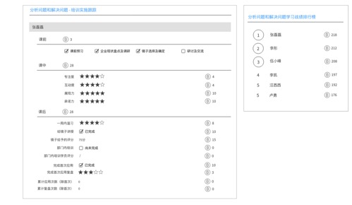 依托互联网,建立对项目完整的执行跟踪管理系统,建立公共的可视化看板,从而让每个学员、每个小组的进展可视化,并通过积分体系建立排行榜,引入良性的PK和竞争,提高学习的紧迫性。