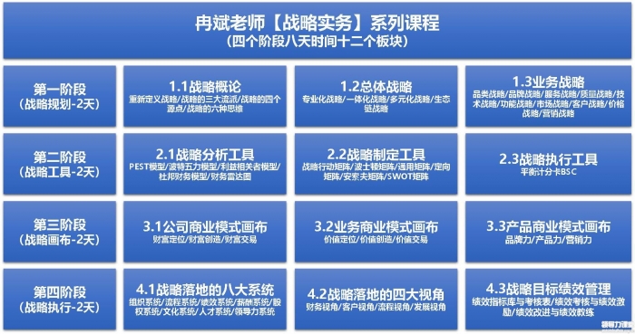 现代企业的竞争,从本质上来讲就是战略的竞争,就是好战略与坏战略的竞争、大战略与小战略的竞争、快战略与慢战略的竞争、蓝海战略与红海战略的竞争。冉斌老师基于数百个咨询案例,从总体战略、业务战略、职能战略、战略地图、八大定位、八大突围的角度与你进行详细分享,有思想,有工具,有案例,有成果,课程极具创新性、时效性、落地性特点。