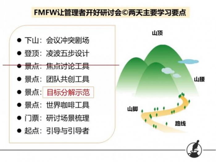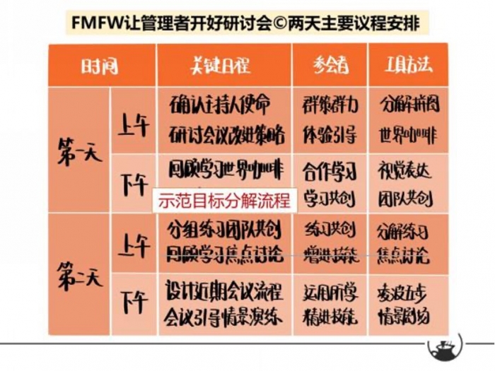 FMFW让管理者开好研讨会©围绕会议改进这个现实管理话题,分为会议规则版、目标分解版和团队融合版,三个版本的教学设计标准化、内容模块化,又可以依据客户需求和应用场景个性设计;两天14小时工作坊运用融合培训和引导的“FMFW五式”作为设计主线,围绕影响会议效率质量的会议规则、会议流程和会议工具开展体验、学习和练习,紧抓会议主持人(引导师)这一影响会议成败的关键角色;其中,FMFW目标分解版,不仅有干货输出,更有示范互动,现场实战成果更是丰硕(216),不仅会传授2个实战常用的会议引导工具和会议流程,还会示范1套共创式目标分解的过程以及产出近期6场会议的关键流程。