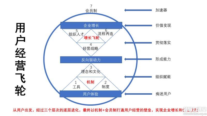 这张图就是用户经营飞轮,它是一个体系化的工程,从用户出发,到最终推进企业增长,并升华成高价值的会员制,一共分为逐层递进的三个层次: